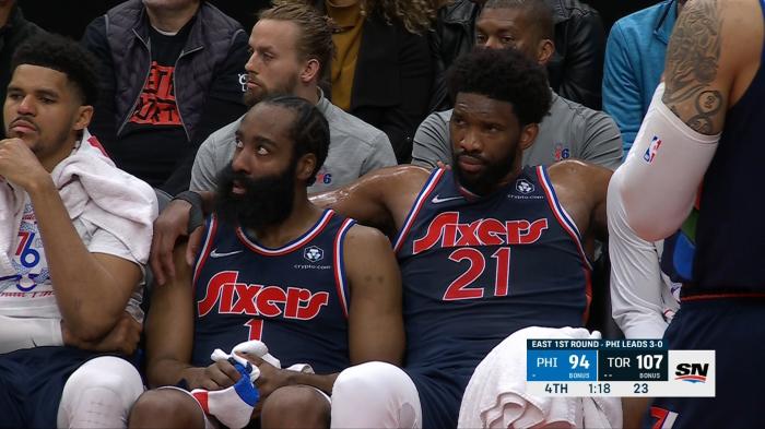 目前76人系列赛大比分3-1领先猛龙,恩比德和哈登有望G5带队晋级东部半决赛。