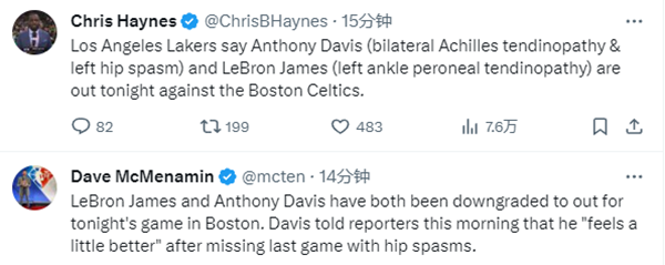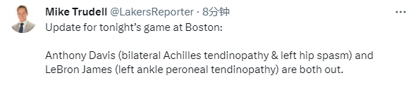 来源:24直播网02-02 13:0124直播网02月02日讯 ,湖人官方更新最新伤情,詹姆斯(左脚踝腓骨肌腱伤势)、安东尼-戴维斯(双侧跟腱伤势、左髋部痉挛)都因伤缺席今天与凯尔特人的黄绿大战。