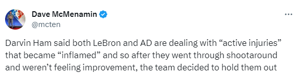 对于詹眉同时伤停,湖人主帅哈姆表示:詹姆斯与浓眉正在应对整个赛季都在困扰他们的伤势,如今出现了炎症,因此在经历投篮训练过后,他们没有感受到情况好,因此球队决定让他们休战。
