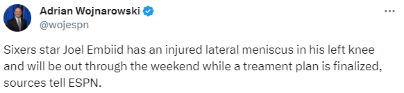 76人遭重创:恩比德左膝半月板受伤 恐彻底无缘MVP等一切奖项