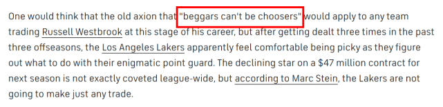 CBS名记萨姆-奎因在相关报道中调侃湖人在威少交易上还挺挑剔,并引用了一句俚语:“beggars can't be choosers(乞丐不能挑肥拣瘦)”。听上去有点膈应,但这就是湖人当前的心态,威少的合同被认为是难以交易的,但即便如此,湖人依然不想贱卖,他们仍在评估各种选择,同一支球队的报价,他们也希望能挑出最好的选择。