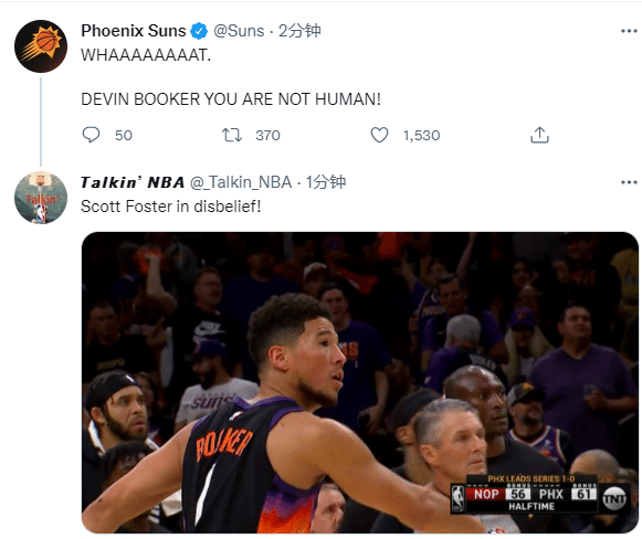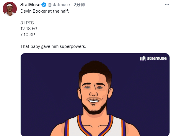 篮网记者发推直言布克就是那个男人(代指科比),太阳官方狂吹:德文-布克,你不是一个人类;美媒调侃那个婴儿给了布克超能力。