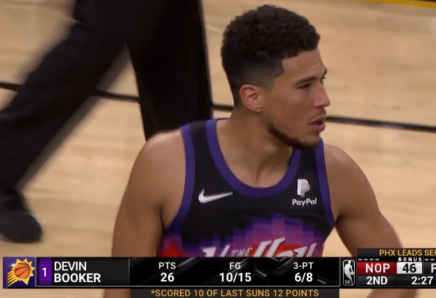布克上半场30+创纪录,生涯第二次半场30+,力压纳什和保罗成为该项纪录太阳队史第一人,也是NBA历史第一位在季后赛多次半场至少投进7记三分且30+的球员。