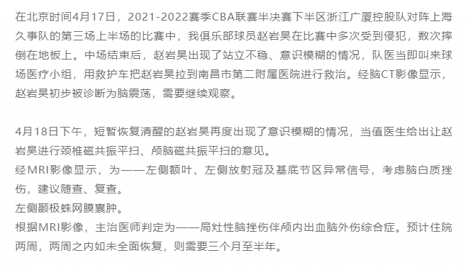 触目惊心!赵岩昊脑震荡+颅内出血,2大将报销重创广厦