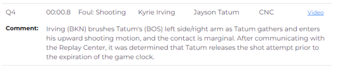 裁判报告还指出,本场比赛最后一攻,欧文碰到塔图姆的手臂,但这并不构成犯规,回放中心确认,塔图姆是在比赛时间结束前投篮的,绝杀有效。
