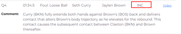 末节1分34秒,斯玛特外线远投三分打铁不中,两队在内线争夺篮板球,最终小库里抢到篮板,裁判报告指出,小库里抢篮板时从背后推倒了杰伦-布朗,这影响了杰伦-布朗争夺篮板,应该吹罚小库里推人犯规,这是一次漏判。