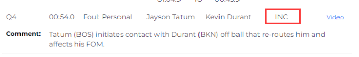 终场前54秒篮网进攻,杜兰特和塔图姆两人的手臂缠在一起,裁判报告指出,塔图姆和杜兰特发生身体接触,这改变了后者的接球路线并且影响后者接球,应该吹罚塔图姆犯规,这也是一次漏判;在这个回合中,杜兰特没有拿到球,欧文持球单干,并且命中关键三分球。