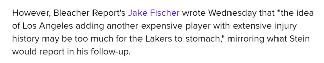 据名记马克-斯坦恩报道,湖人不太可能同意用威少换来以戈登-海沃德为核心的筹码。虽然湖人在威少的相关交易中并不占据有利地位,但球队在探索相关选择时依然会小心翼翼,不会随意甩卖威少。斯坦恩还表示“伤病史”将是湖人在任何交易里的首要考虑因素。