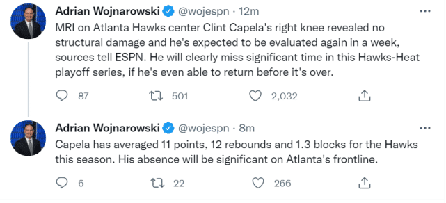 本赛季常规赛,卡佩拉出战74场,场均得到11.1分11.9篮板1.2助攻1.3盖帽。他的缺阵对于老鹰的前场来说是一大损失。卡佩拉的受伤出现在距离上半场结束还有30.7秒时!卡佩拉在防守莫布利时犯规,但莫布利倒地后撞到了卡佩拉的右膝,导致卡佩拉意外伤退。