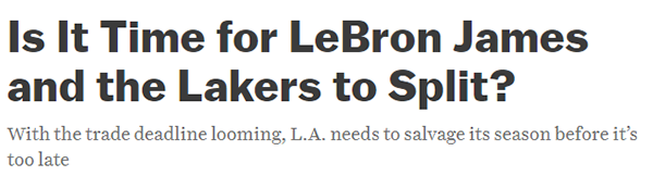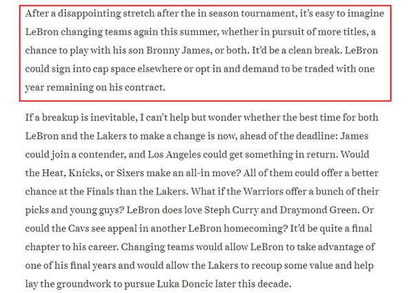 NBA记者Kevin O'Connor撰写了一遍标题为“詹姆斯是时候和湖人分道扬镳了吗?”的长文,他表示若湖人按兵不动导致湖人早早无缘季后赛且詹姆斯认为球队过于关注未来,詹姆斯可能决定今夏离开湖人。