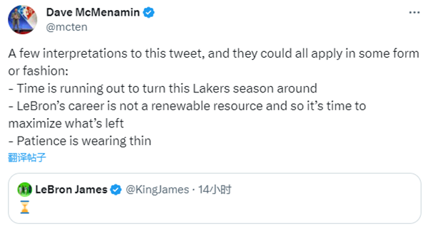 詹姆斯凌晨2点多发推,晒出一个沙漏的表情,究竟老詹暗示什么倒计时?湖人随队记者Dave McMenamin解读詹姆斯的神秘推文,发推写道:湖人扭转赛季的时间已经不多了;勒布朗的职业生涯不是可再生资源,所以是时候最大限度地利用剩下的资源了;(勒布朗的)耐心正在消失。