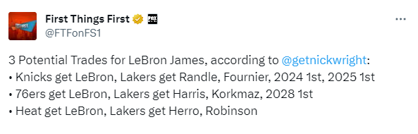 詹姆斯的神秘推文引发的他可能离开湖人引热议,名嘴Nick Wright在节目中列出关于詹姆斯的三笔潜在交易方案:1、尼克斯得到詹姆斯,湖人得到兰德尔、富尼耶、2024年首轮签和2025年首轮签;2、76人得到詹姆斯,湖人得到哈里斯、科尔克马兹和2028年首轮签;3、热火得到詹姆斯,湖人得到希罗和罗宾逊。