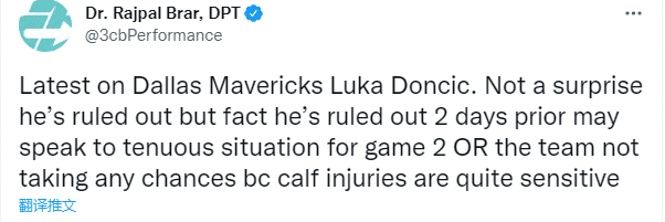 另一医学专家Rajpal Brar发推写道:东契奇缺席G1并不令人惊讶,事实上他在两天前就被排除在外了,他首轮G2复出的情况并不乐观,因为小腿的伤势很敏感。