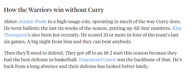 斯雷特认为普尔将成为一个使用率很高的角色,他会像库里那样打球。本赛季的最后六周,普尔的状态很好,打出了全明星级别的表现。汤普森近期的状态也很不错,勇士最后6场常规赛,汤普森有4场至少得到33分。如果他有出色的表现,勇士真的可以击败任何对手。