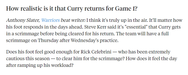 届时,库里的脚是否感觉好到让非常谨慎的训练师Rick Celebrini让他允许参加队内训练赛?他参加训练赛后第二天的感觉如何?这都是决定库里能否参加首战的关键条件。