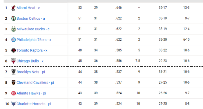 来源:24直播网04-11 16:2424直播网04月11日讯 ,东部常规赛的最终排名出炉!热火拿到东部常规赛冠军,凯尔特人最后时刻升至第二,雄鹿排名第三,费城排名第四。第5到第10的分别是猛龙、公牛、篮网、骑士、老鹰和黄蜂。