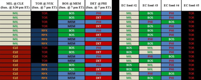 目前,猛龙已经锁定东部第5,但东部第2-4位的排名没有确定。雄鹿(MIL)、凯尔特人(BOS)、76人(PHI)和猛龙(TOR)明天的比赛结果也有16种可能性,影响着最终排名。