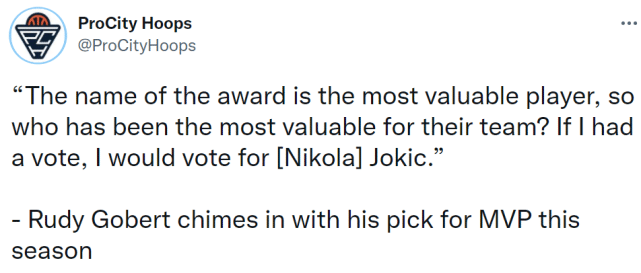 三届DPOY认可!戈贝尔力挺约基奇:如果我有1票 我选他当MVP