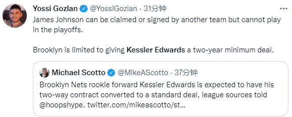 NBA常规赛收官阶段,篮网正式裁掉悍将詹姆斯-约翰逊,腾出一个名额,将和爱德华兹新签一份正式合同,这样的话,爱德华兹有资格为篮网参加季后赛。