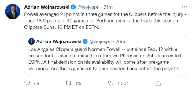 快船迎来重大利好,据名记沃纳罗斯基报道,消息源透露,快船后卫诺曼-鲍威尔计划在今天对太阳的比赛中复出。他预计会在赛前热身后做出最终上场决定,鲍威尔在受伤前为快船出战3场比赛,场均21分,他和乔治还没在一起打过球。
