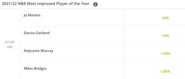 进步最快球员奖的领跑者是灰熊的莫兰特(-600),他的领先优势明显。上赛季,莫兰特场均19.1分4篮板7.4助攻,而本赛季至今是27.6分5.7篮板6.7助攻,进步幅度很大。排名第二至四位的是加兰(+300)、德章泰-穆雷(+1600)、迈尔斯-布里奇斯(+2800)。