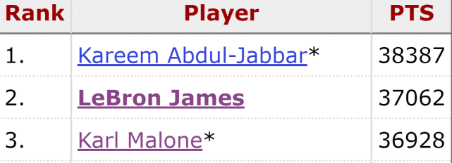 目前,詹姆斯还差1326分超过贾巴尔,成为新的NBA历史得分王,而这项纪录已经保持了38年之久。