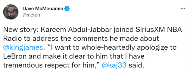 贾巴尔向詹皇道歉!强调非常尊重勒布朗:无意以任何方式批评他