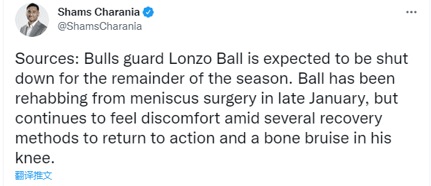 芝加哥公牛又有坏消息,据名记shams报道,朗佐-鲍尔因膝伤将缺席本赛季剩余的全部比赛,因伤提前赛季报销;鲍尔在康复过程中遭遇挫折,尝试不同的治疗方案仍感到不适。
