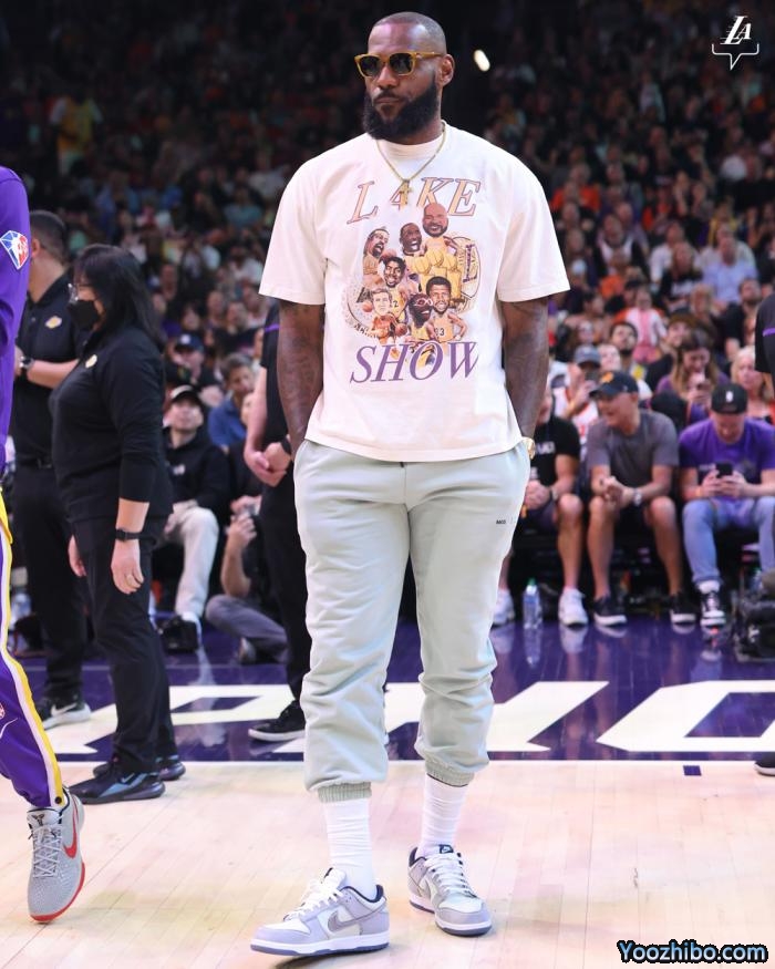 詹姆斯穿的T恤上印着科比、奥尼尔、张伯伦、魔术师、贾巴尔等湖人名宿的动漫照,并且印着湖人秀;老詹双手抄兜,依旧满脸严肃的表情,湖人官推晒照并且发推写道:代表湖人家族。