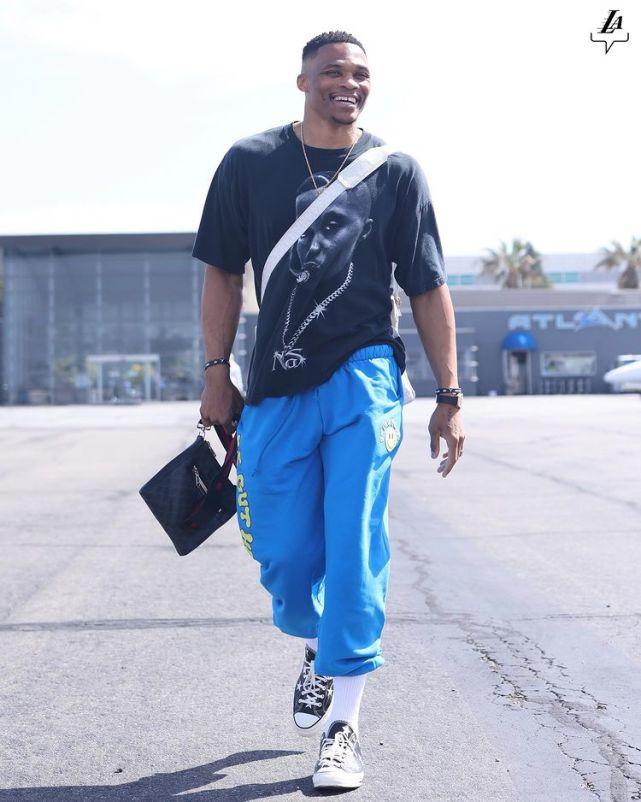 威少笑得更开心了,他穿着短袖和蓝色运动裤,斜跨包,笑容很灿烂。对掘金一战,威少27分10篮板7助攻,命中率也很高。有美媒评价这是威少加盟湖人以来打得最好的比赛,现在的湖人,只能是尽人事听天命了。他们能否获得附加赛资格,也得看竞争对手的表现。