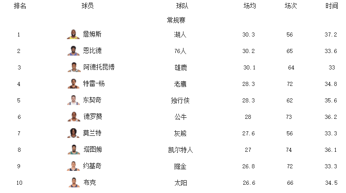 得分王层面,目前竞争的是字母哥、恩比德和詹姆斯,目前詹姆斯排名第一,他总分1695分,场均30.27分。恩比德经历了昨天的44分之后,已经反超字母哥,他场均30.20分,仅仅落后詹姆斯0.07分,差距已经很小。字母哥场均30.08分,依旧有希望冲击得分王,但需要努力了。这三人场均得分都是30+,竞争相当激烈。