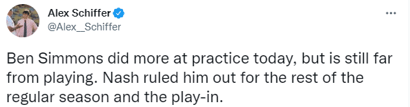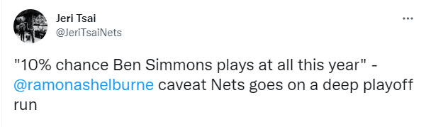 Evan Jeffries列出西蒙斯的背伤时间线——2020年2月最初的背部受伤,2021年10月(背部紧张) ;2022年2月被交易至布鲁克林,与篮网一起训练导致背伤复发 ;2022年3月遭遇腰椎间盘突出并接受硬膜外注射治疗,时至今日,西蒙斯还不能奔跑。