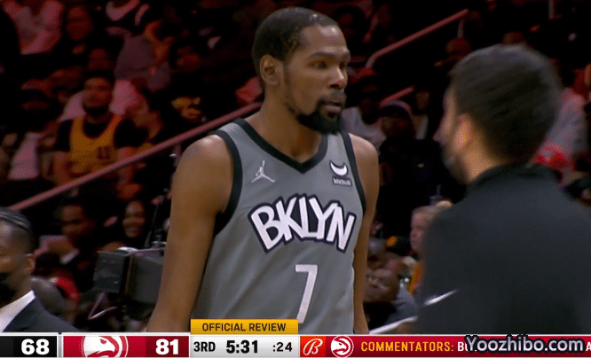 第二节,杜兰特坐在替补席休息并且看数据统计表,欧文单核带队被老鹰反超,6分19秒,杜兰特重新上场,死神再次开火,无解中投、外线三分以及强硬2+1,欧文也续上三分火力,篮网疯狂追分,可上半场最后76秒,篮网被老鹰打出8-0,特雷-杨压哨上篮,篮网半场落后15分,单节20-37狂输17分,杜兰特一人贡献10分。