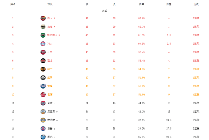 目前热火49胜28负排名第一,他们极有可能获得常规赛东部第一。雄鹿48胜29负排名第二,凯尔特人47胜30负、76人46胜30负,分居第三和第四名,除了热火领跑之外,剩下的这3支球队整体的差距并不大,只有1.5个胜场。而接下来的比赛中,东部前列球队的卡位就很关键了。