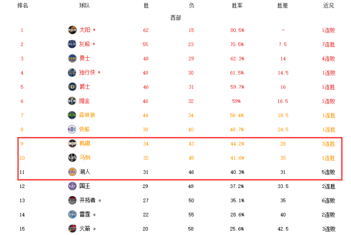 目前鹈鹕、马刺和湖人都只剩下5场常规赛,鹈鹕34胜、马刺32胜、湖人31胜,接下来湖人的对手是掘金、勇士和太阳这样的强队,虽然詹姆斯和浓眉哥复出,但吃到5连败,同时最近11场比赛输了9场,士气低迷,落后马刺鹈鹕的差距在扩大,想要争夺附加赛的资格,难度很大。
