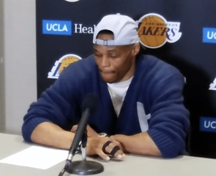 另外值得一提的是,上一场湖人惨败爵士,威少也遭遇伤病,赛后接受采访时,威少把两个手指绑在一起。