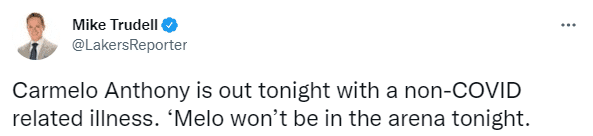 湖人对阵鹈鹕赛前,湖人记者Mike Trudell报道,卡梅隆-安东尼因生病缺席(与新冠无关)今天的比赛,并且安东尼今天不在球馆中,不会坐在场边观战。