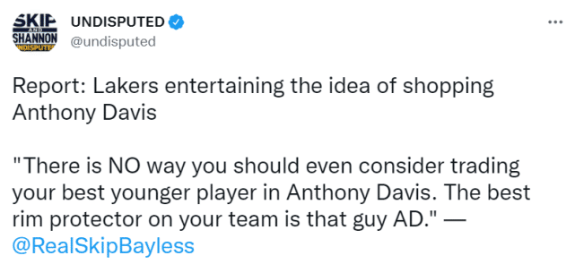 两人还谈论到湖人有可能在今年夏天讨论交易浓眉。贝勒斯认为湖人绝对不应该考虑交易队内更年轻的最佳球员戴维斯,他也是队内最好的护筐者。而夏普的建议是湖人至少应该探索一下交易的可能。“我不知道湖人能得到什么回报,因为他们没什么其他的可以提供。如果你的队伍里有詹姆斯,你不想要选秀签,你需要一个能马上出战的球员。”