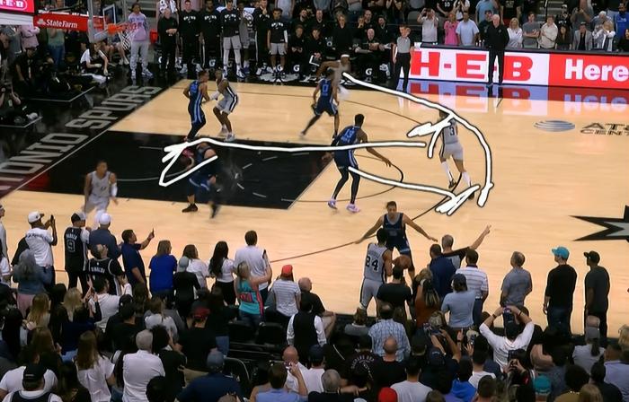 直接回到本场比赛最令人心痛的一个回合。最后5.2秒,灰熊进攻不中,马刺拿到球权。老帅波波维奇叫出暂停,布置边线球。结果,马刺跑出了一次近乎完美的战术。凯尔登约翰逊佯装掩护,随后突然拆开来到内线。马刺人到球到,约翰逊接球上篮。