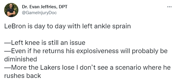 詹姆斯本赛季还会回归吗?医学专家Evan Jeffries发推写道,詹姆斯左脚踝扭伤,在球队每日观察名单上,除此之外,詹姆斯左膝一直有问题,即使他提前复出,他的爆发力也可能减弱;当湖人输的更多时,我觉得他不会火线复出。