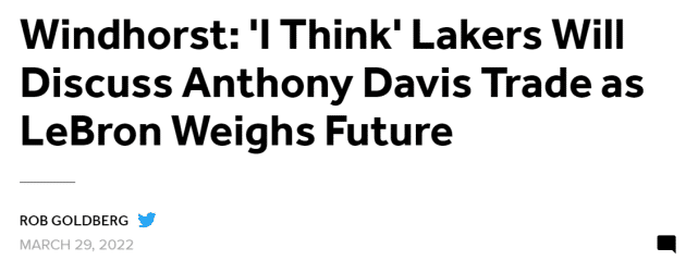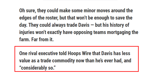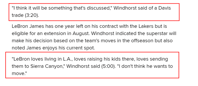 主持人询问湖人是否有可能交易浓眉,文霍斯特说这是湖人将会讨论的内容,但他个人认为交易浓眉将是一个错误,因为健康的浓眉是联盟前15的球星,你很难找到一个他的替代者。此前,匿名的NBA高管曾讨论浓眉的交易价值。他说:“他们(湖人)随时可以交易戴维斯,但他的伤病史不会让对方球队愿意下血本,而且远不会提供这样级别的筹码。戴维斯的交易价值比以往任何时候都低,而且低得多。”赛季至今,浓眉因伤只打了37场比赛,场均23.1分9.7篮板2.9助攻。