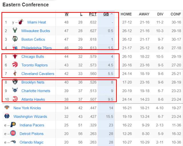 现在的东部形势,几乎是一天一变。从胜场差上来看,前十球队基本分为三大军团。第一军团是前四,他们之间的胜场差都是0.5场。第二军团是公牛、猛龙和骑士,他们之间的胜场差在0.5-1场之间。第三军团就是篮网、黄蜂和老鹰,他们之间的胜场差也不大,仍有可能发生位次的变化。篮网如果打进季后赛,最可能的位次就是第七或者第八,谁会成为他们的首轮对手呢?