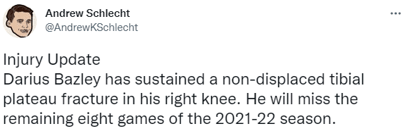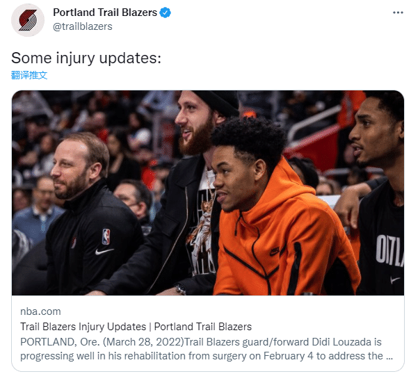 开拓者官宣,努尔基奇(脚部伤病)、安芬尼-西蒙斯(膝盖伤病)和布莱德索(跟腱伤病)因伤赛季报销,他们都因伤缺席至今,都不会出战剩余的比赛;另外开拓者宣布约什-哈特因左膝髌腱伤势将至少再缺席一周,此前名记确认利拉德本赛季不会复出。