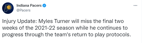步行者官方宣布迈尔斯-特纳缺席常规赛最后两周的比赛,本赛季步行者还剩下7场比赛且早已无缘附加赛,这意味特纳赛季报销,他遭遇左脚应力反应;本赛季出战42场比赛,特纳场均拿到12.69分7.1篮板和2.8盖帽;目前步行者25胜50负排名东部第13位。