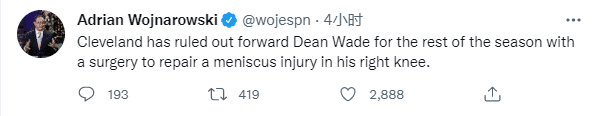 据名记沃纳罗斯基报道,骑士前锋迪恩-韦德接受右膝半月板手术,将缺席本赛季剩余比赛;本赛季为骑士出战51场比赛,场均5.3分2.9篮板1助攻,目前骑士41胜33负排名东部第七。