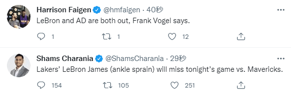湖人对阵独行侠赛前,ESPN名记DaveMcMenamin表示詹姆斯和浓眉都不太可能今日的出战,之后湖人主帅沃格尔确认湖人两大巨头都因伤缺席比赛。