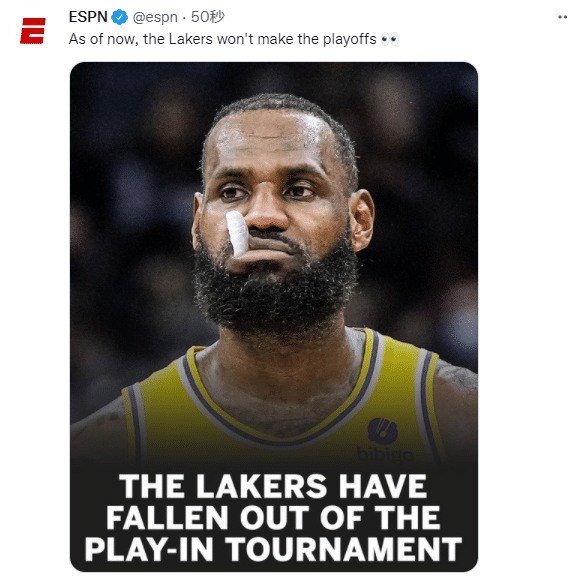 ESPN晒出湖人掉出附加赛区,发推写道:根据目前的排名,湖人将无缘季后赛。
