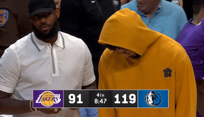 今日一战,詹姆斯和浓眉都是身穿便装坐在场边观战。