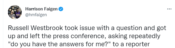 采访时,威少不满记者的问题,反问记者:你有答案吗?然后威少起身并且离开新闻发布会。好像有记者问威少:你认为应该改变什么?如此问题惹怒威少,后者愤然离场。