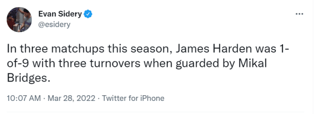 最大的功劳要记在布里奇斯身上,因为他是主防哈登的那个人,是他打乱了哈登的进攻节奏。赛后,蒙蒂谈到布里奇斯对哈登的防守时说:“詹姆斯(哈登)是一个名人堂球员,一个MVP,但米卡尔(布里奇斯)利用身材优势防他防得很不错。”